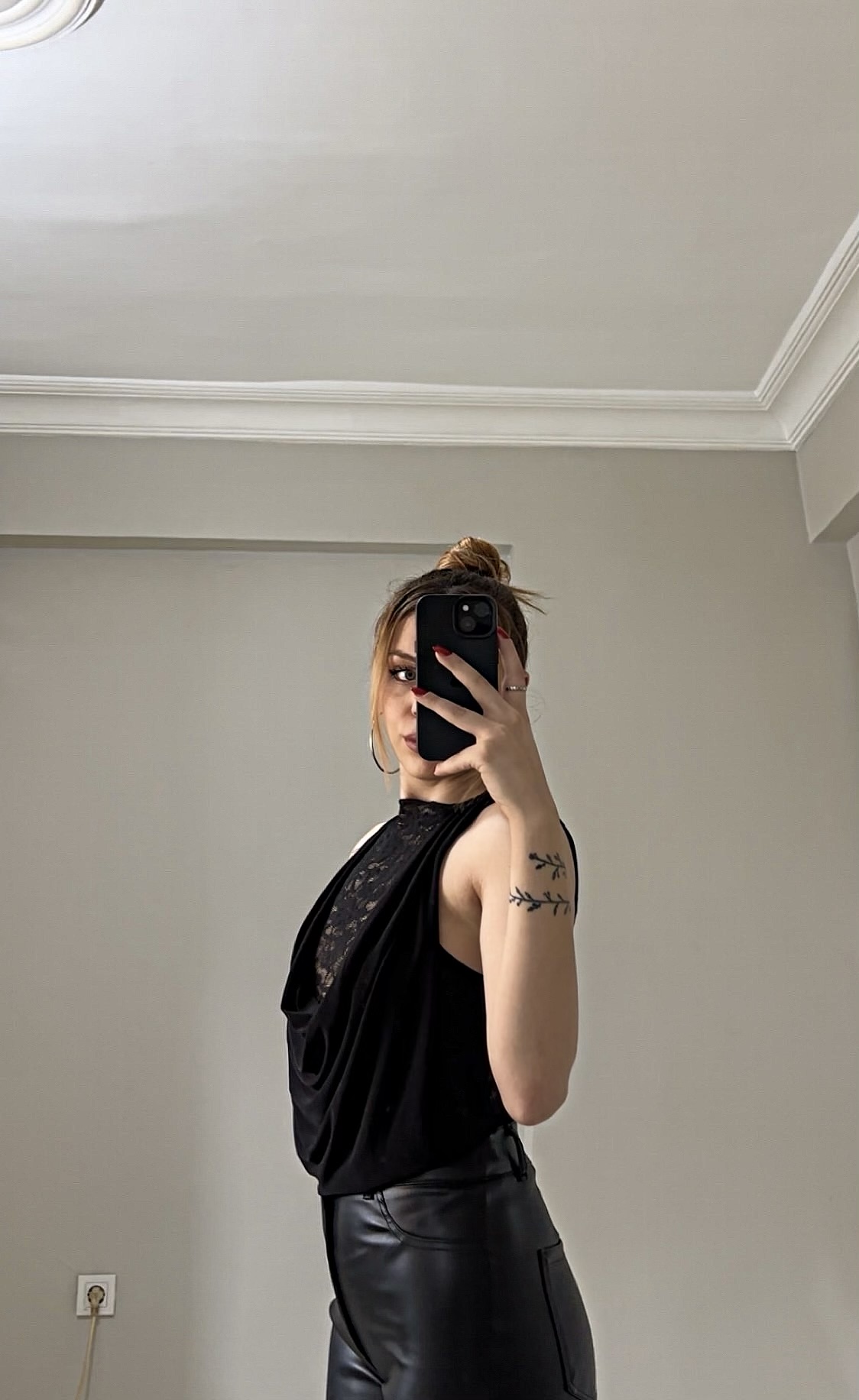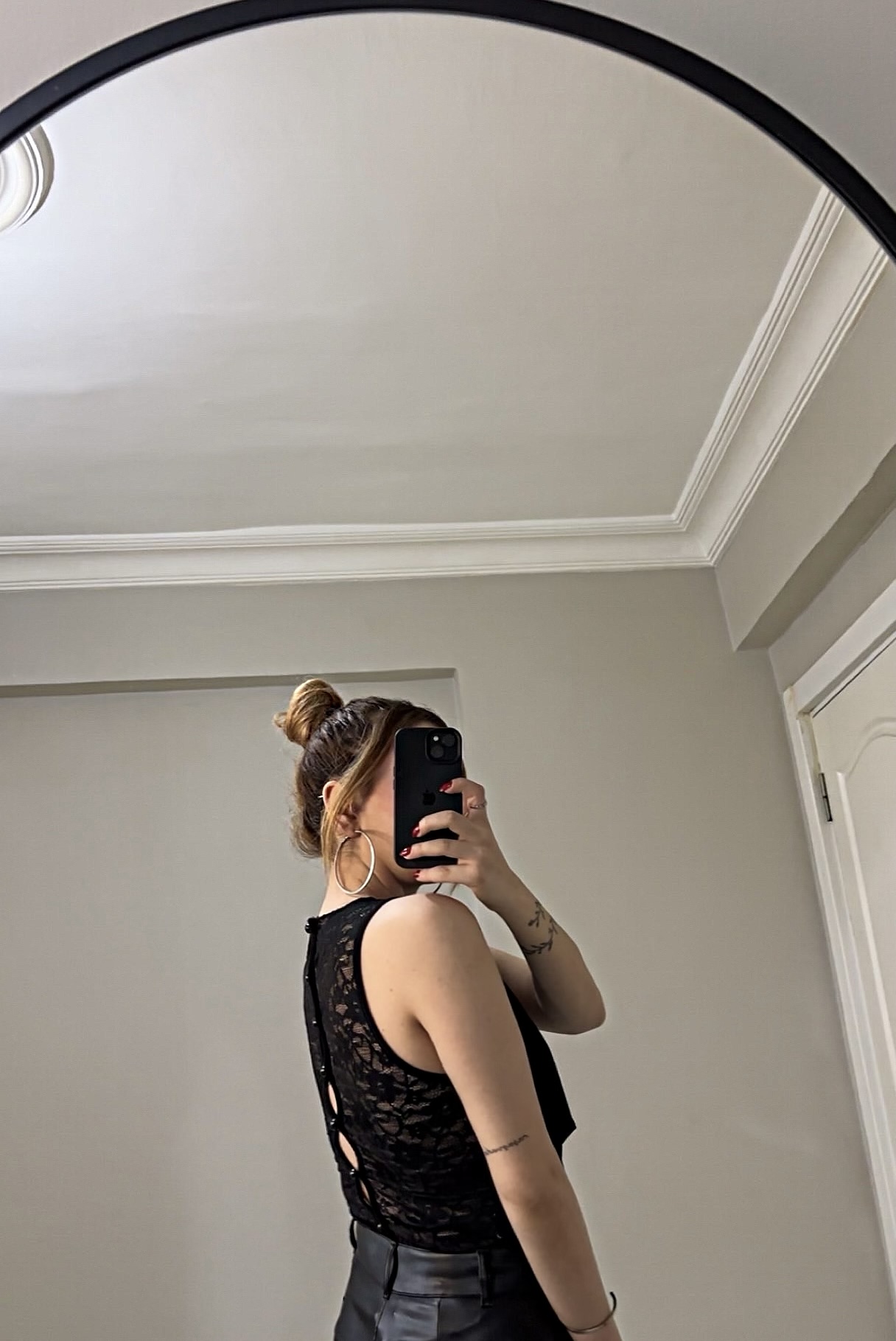Dantelli Dökümlü Arkası Düğmeli Siyah Bluz